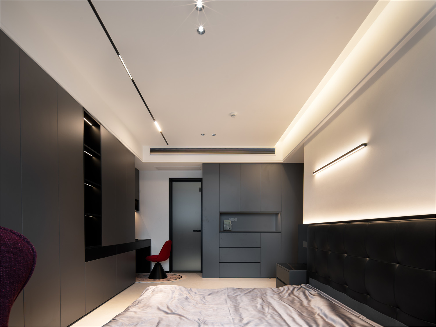 简约的白色点缀上深色床具,质朴简约而又不失高级感。与白色墙面融为一体的衣柜实用性强且不会过于突兀。