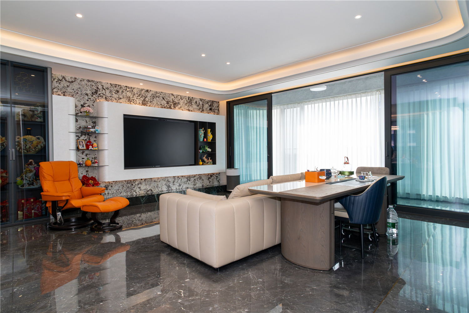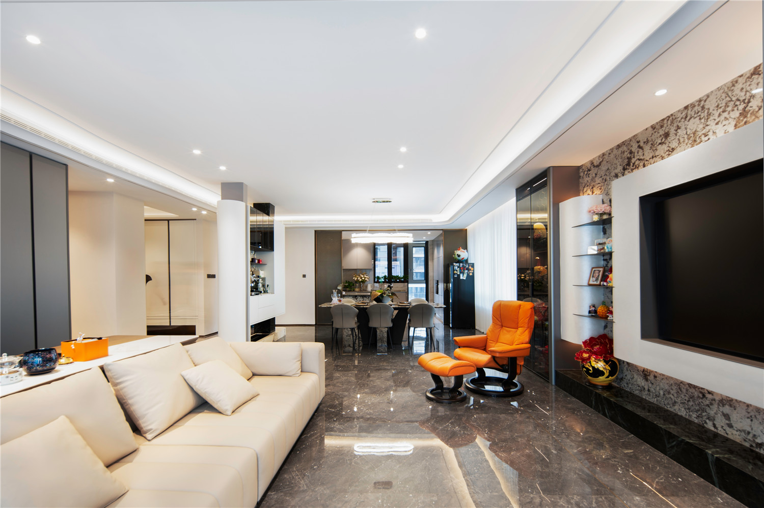 深灰色的暗纹大理石地板搭配上设计感十足的几何灯饰,现代时尚气息显露无疑。大面积的落地窗为就餐区域增添了明亮大气美。灰色与亮橘色搭配的餐椅,则为整个空间注入了一抹清新的律动美。