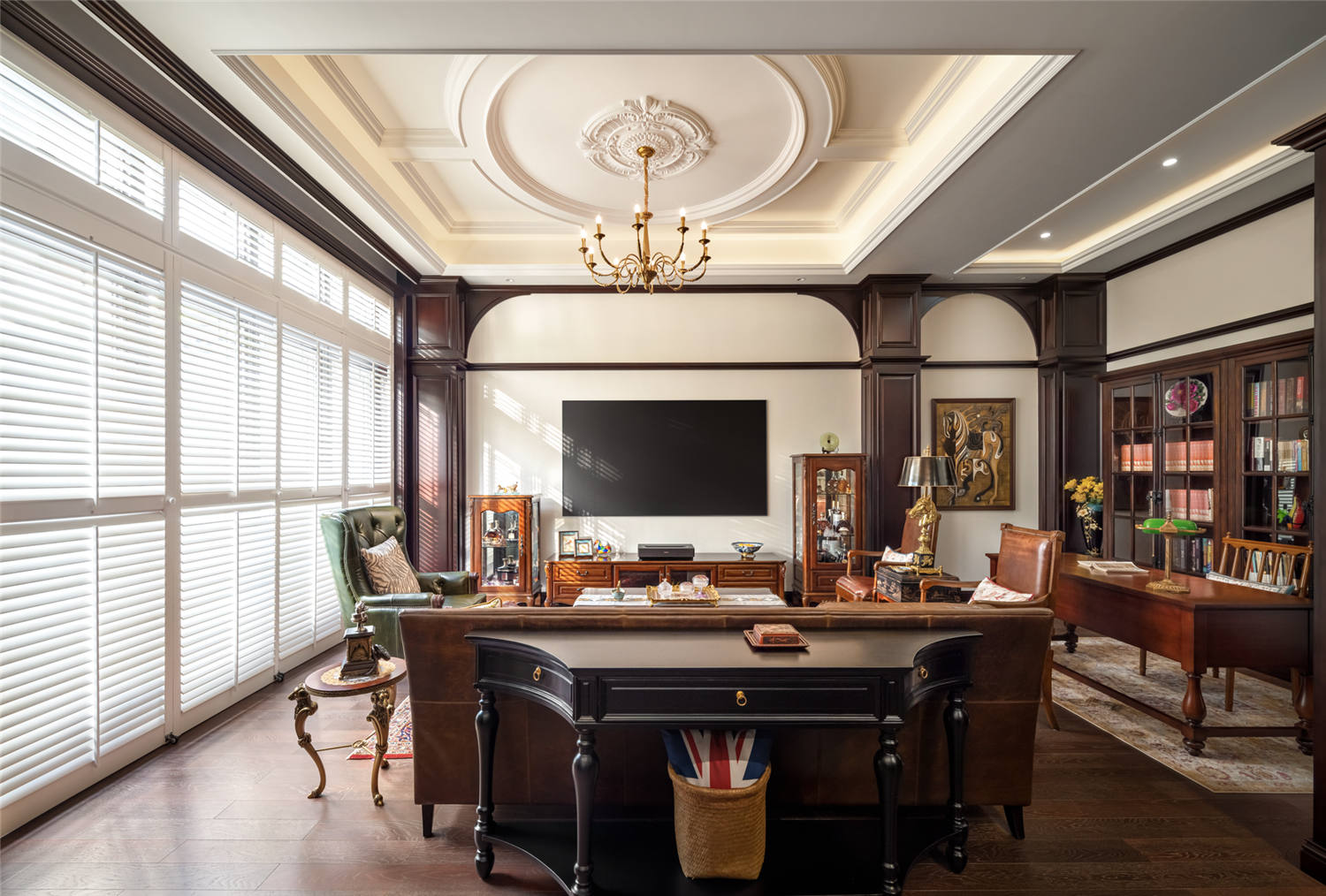 带有木材天然纹理的深棕色书柜、桌椅搭配上简约的绿植,一种浑厚端庄的大气之美呼之欲出,让整个书房空间更显肃静高级。