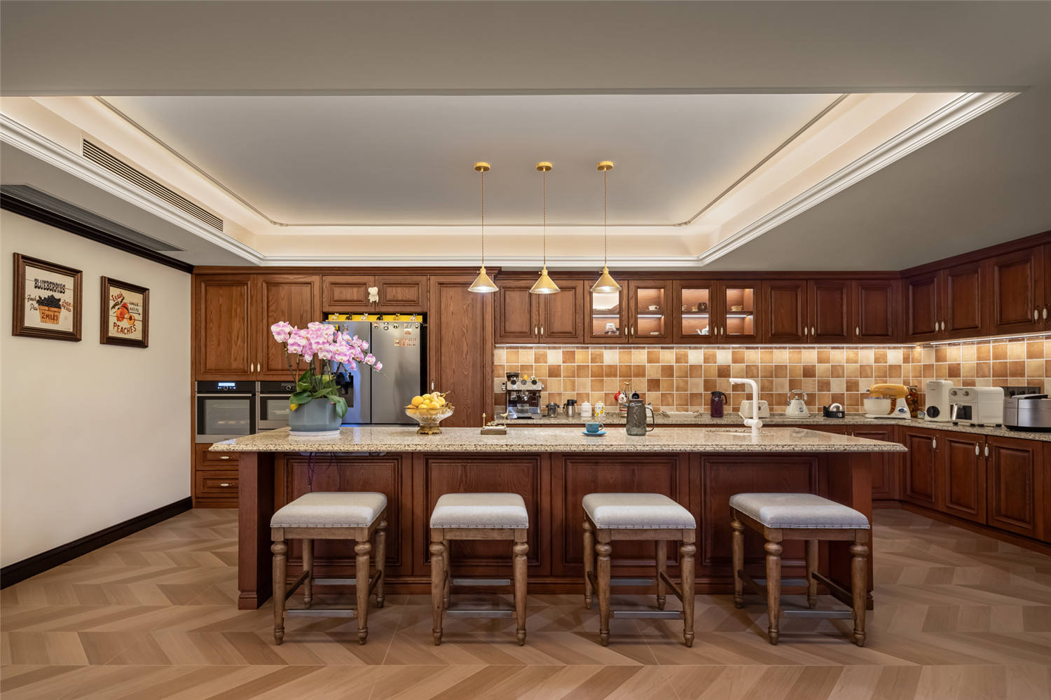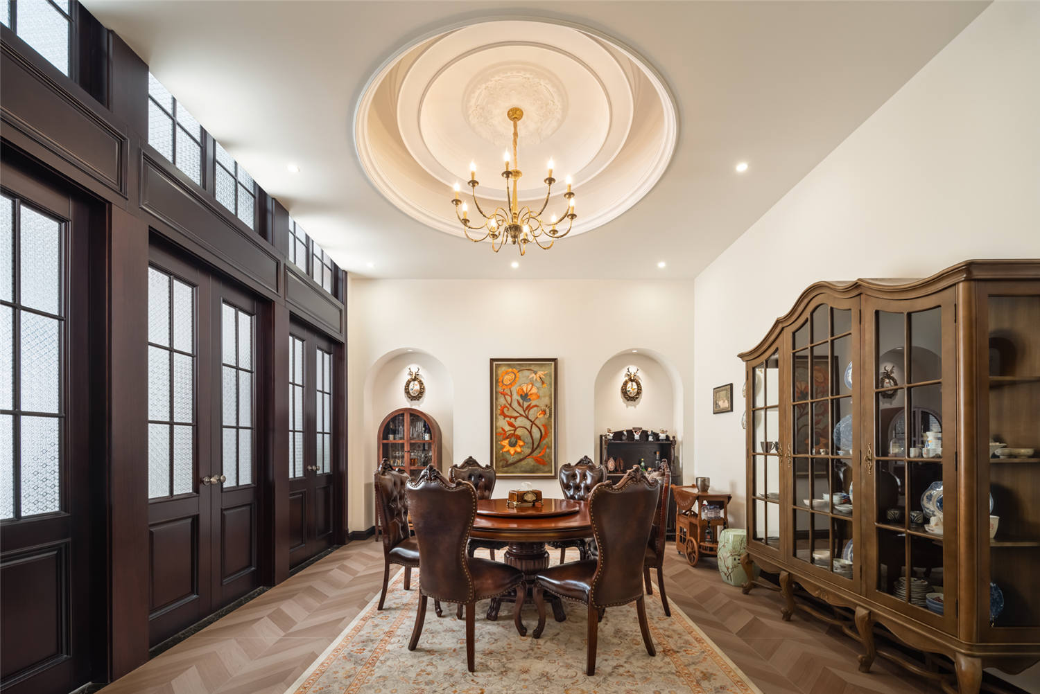 餐厅区域选用了经典的黑白配色,大面积的白色搭配上黑色餐桌椅,营造较强的视觉冲击效果。圆形凹显的吊顶设计搭配上低调简约的巨型吊灯,则让轻奢的浪漫之美更好显露。