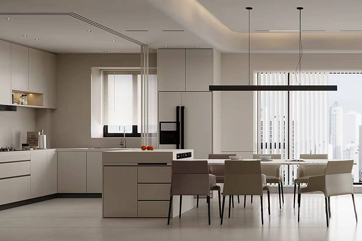 厨房空间面积不算大,因此设计师选用了经典的“L”形设计,避免出现难以转身的情况。同时借助大面的储物收纳设计来满足各类厨房用具的归置需求。
