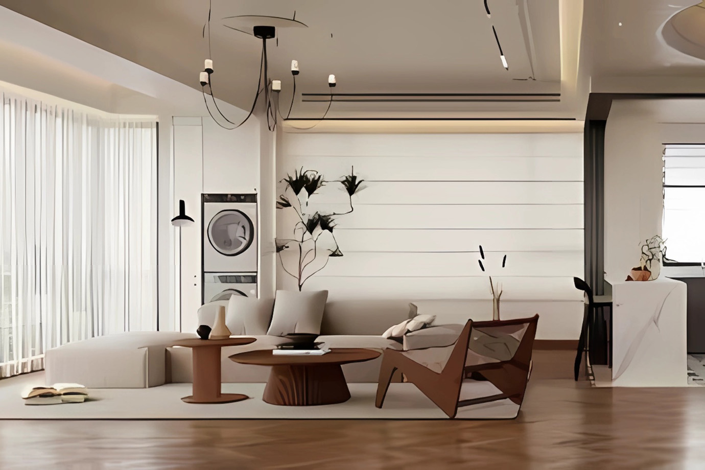 水岸星城这套四居室的占地面积约为230㎡,整体户型偏狭长形,这也就导致了部分过道走廊区域的面积相对比较拥挤,因此需要设计师做好各功能衔接处的细节处理,提升空间品质感。同时,借助各类软隔断提升室内空间界限感的同时有效避免环境给人压抑感。而色彩的选择上,则大面积使用了素雅清新的色系,强调温馨柔和美。