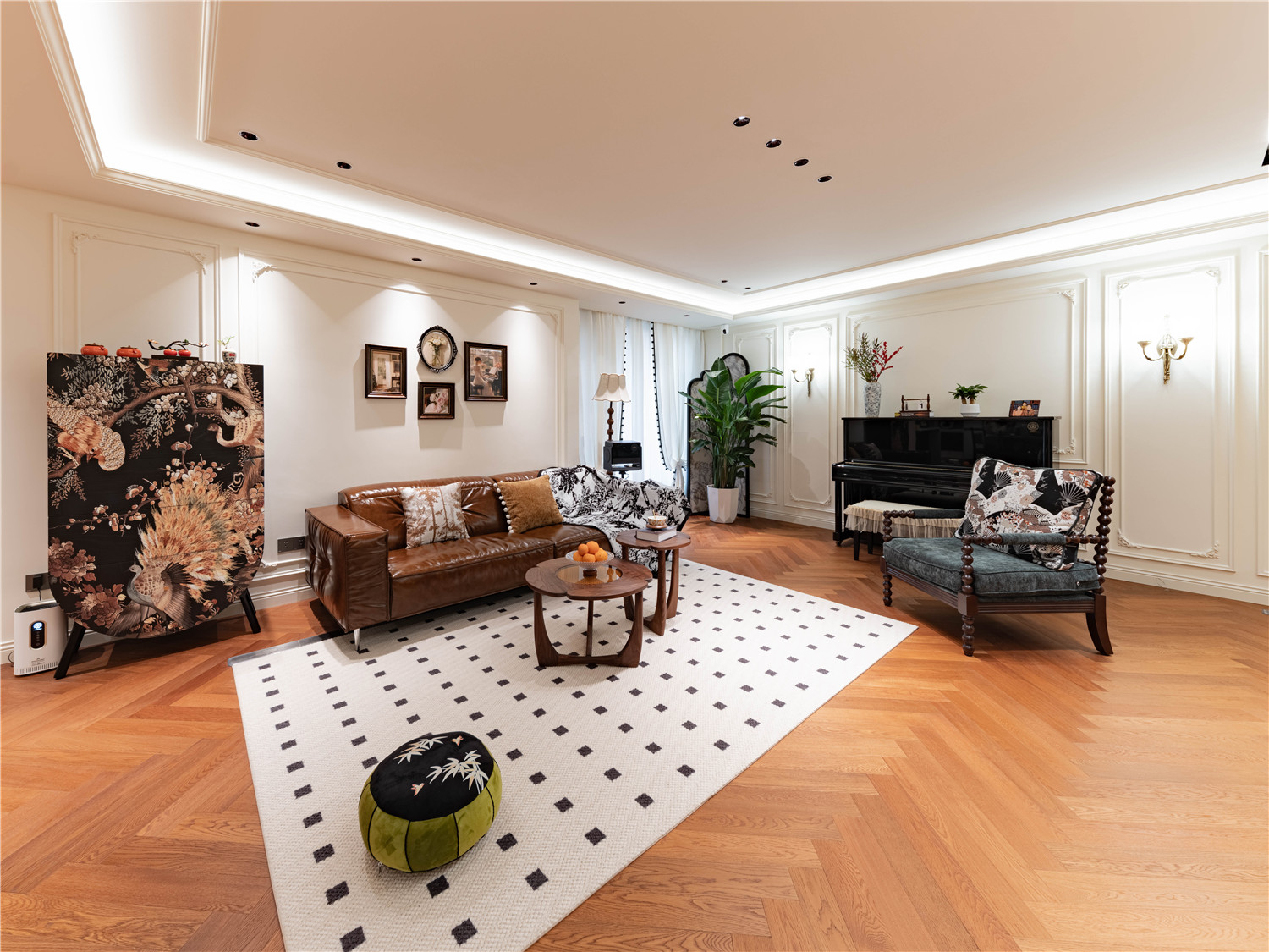 这是一所坐落在梦湖香郡的267平方米复式大别院,空间户型方正、南北通透且采光好,因此设计师在进行设计的时候将空间户型优势发挥到极致,利用大面积的落地窗设计让室内空间看起来更加明亮洁净。为满足业主的审美需求,空间整体使用了较多深色元素,以营造一种沉稳氛围,再搭配以欧式风情元素,强调典雅复古魅力。
