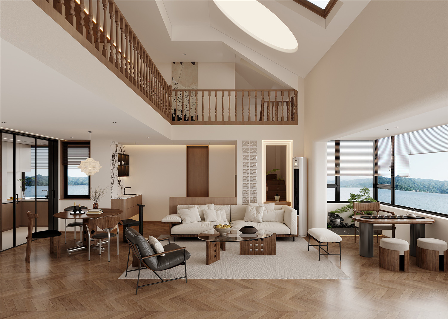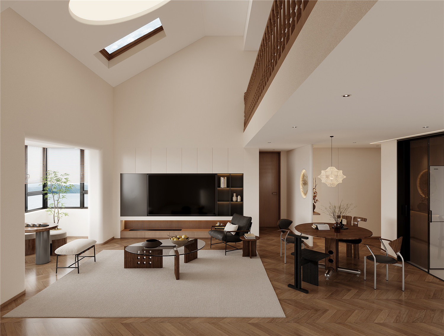 餐厅区域沿用了与客厅空间相同的配色与用材,不同的是设计感十足的吊灯与清新感十足的花鸟挂画,让就餐区域多了一抹温馨靓丽气息。