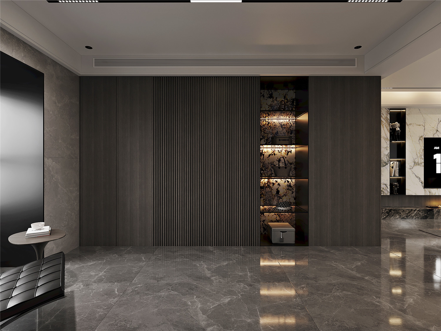 清冷的灰色暗纹大理石地板搭配上方正的深褐色木质家具,强调沉稳大气格调。对称式的软装设计,则让整个空间更显优雅稳重气息。