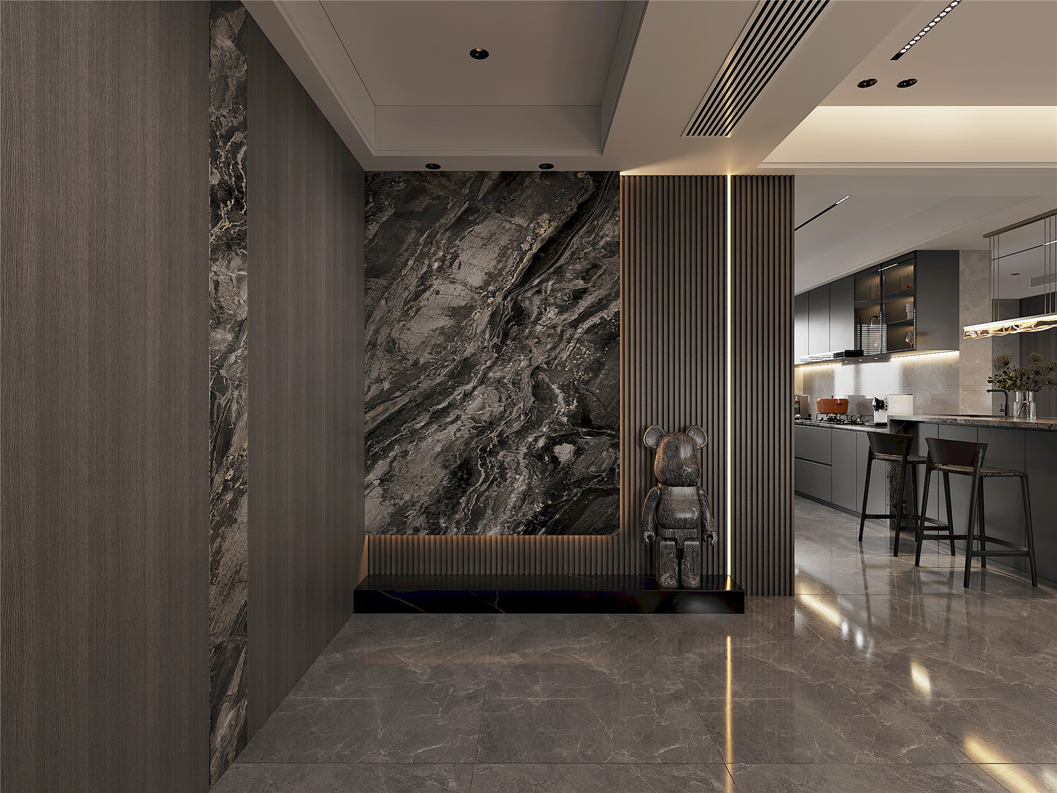 大面积的大理石瓷砖奠定了清冷通透的空间氛围,搭配以质感温润的木材,有效提升了空间的视觉平衡感。