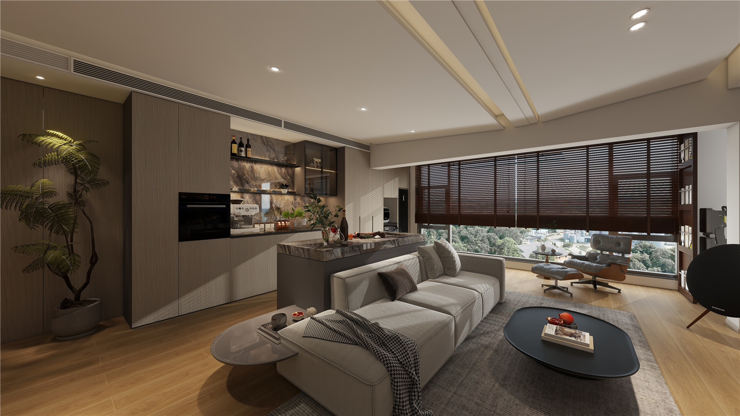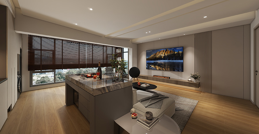 可以区域借助大理石大面打造结构感,并利用高低差满足日常坐卧需求,现代时尚感浓烈。