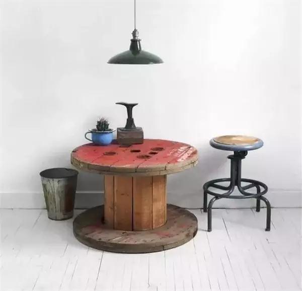 一旦电缆线用完,电缆线盘就变成了废物,但它可是茶几的绝佳替代物。实木质感,粗犷的原始风貌,带来浓浓的工业风。底盘堆放上一些书籍,又成为阅读休憩的好地方。
